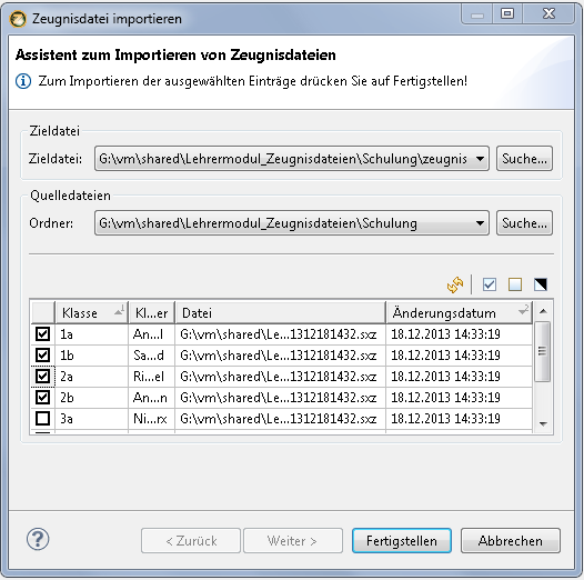 Dabei werden aus dem Ordner für die Quelldateien nur die Klassen und Dateien zur Auswahl angeboten, die mit der Zieldatei zusammen passen, also von der gleichen Schule stammen.