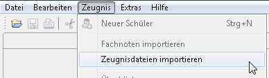 Nach Aktivierung in den Benutzervorgaben kann die Funktion "Zeugnisdateien importieren" über das Menü Zeugnis > Zeugnisdateien importieren aufgerufen werden.