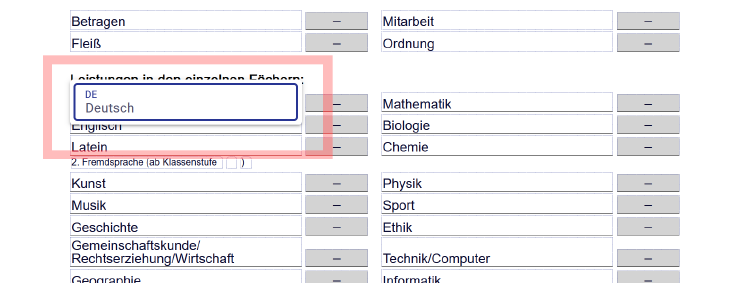 - Für manche Fächer (z. B. „2. Fremdsprache“) kann aus einer Auswahlliste ausgewählt werden.