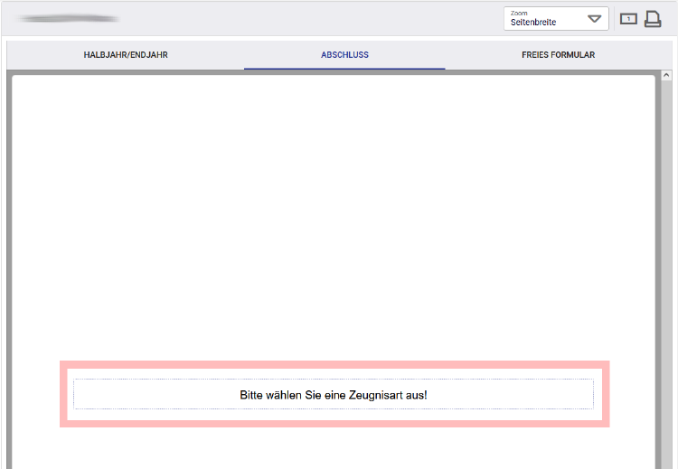 • Im Arbeitsbereich muss zunächst zwischen „Halbjahr/Endjahr“, „Abschluss“ und „freies Formular“ gewählt werden. Nach Auswahl einer Kategorie wird das Zeugnisformular angezeigt.