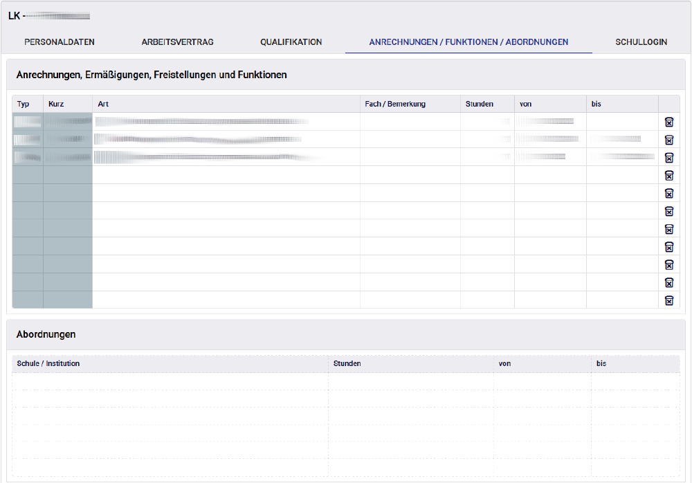 Im Register „Anrechnungen / Funktionen / Abordnungen“ sollen alle schulbezogenen Anrechnungen, Ermäßigungen, Freistellungen, Funktionen und Abordnungen für den örtlichen Personalrat erfasst werden.