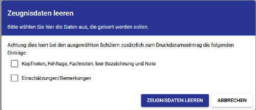 - Über das Papierkorb-Symbol können zum Endjahr die eingegeben Noten sowie Einschätzungen/Bemerkungen aus dem Halbjahr gelöscht werden.