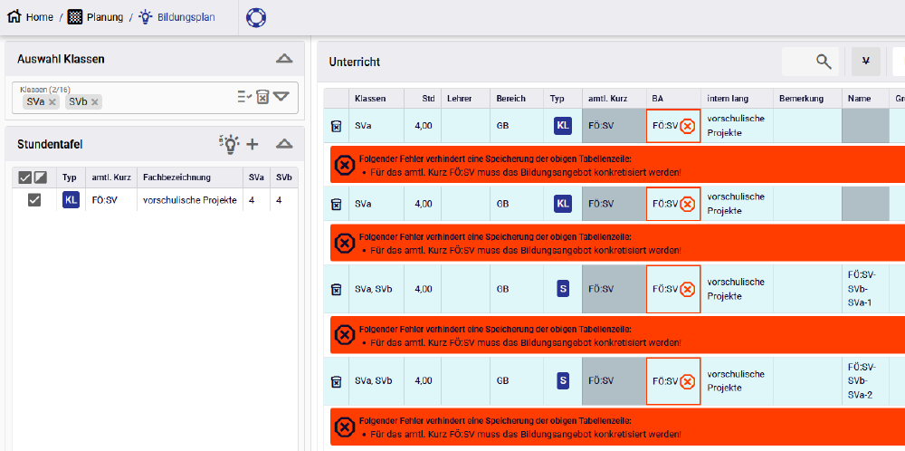 • Im Bildungsplan in der Klassenstufe SV für jedes Handlungsfeld ein oder bei Bedarf mehrere Zeilen mit dem amtl.Kurz FÖ:SV anlegen.