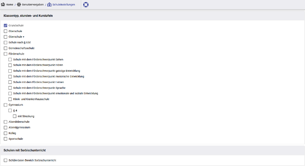 Mit der Maske „Schuleinstellungen“ können die Schularten und Schultypen der Schule gewählt werden. Diese Einstellungen steuern den Umfang der Auswahlfelder und der darin zur Auswahl stehenden Werte.