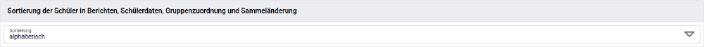 - Im Auswahlfeld „Sortierung“ kann die Standardsortierreihenfolge für die Auswahllisten von Schülerinnen und Schülern im Dialog „Berichte“ sowie in den Masken „Schülerdaten“, „Gruppenzuordnung“ und „Schülerdaten Sammeländerung“ geändert werden. Zur Auswahl stehen: