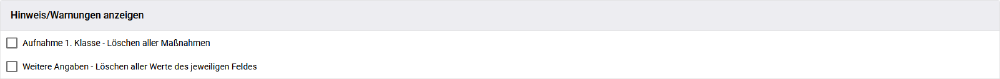 - Mit Hilfe der Auswahlfelder „Aufnahme 1. Klasse - Löschen aller Maßnahmen“ und „Weitere Angaben - Löschen aller Werte des jeweiligen Feldes“ können die jeweiligen Hinweisdialoge wieder eingeblendet werden, die zuvor in der Maske durch Anwahl des Feldes „Hinweis nicht wieder anzeigen“ dauerhaft ausgeblendet wurden.