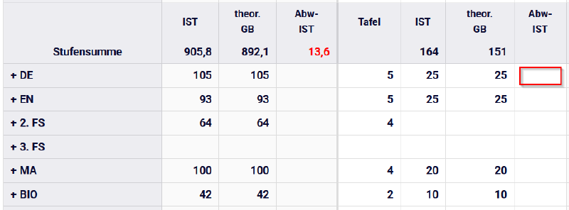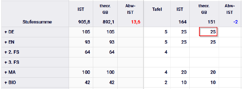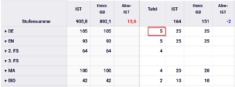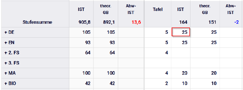 Unter der Stufensumme werden alle Tafelfächer angezeigt, die in den Stundentafeln der gebildeten Klassen vorkommen.
