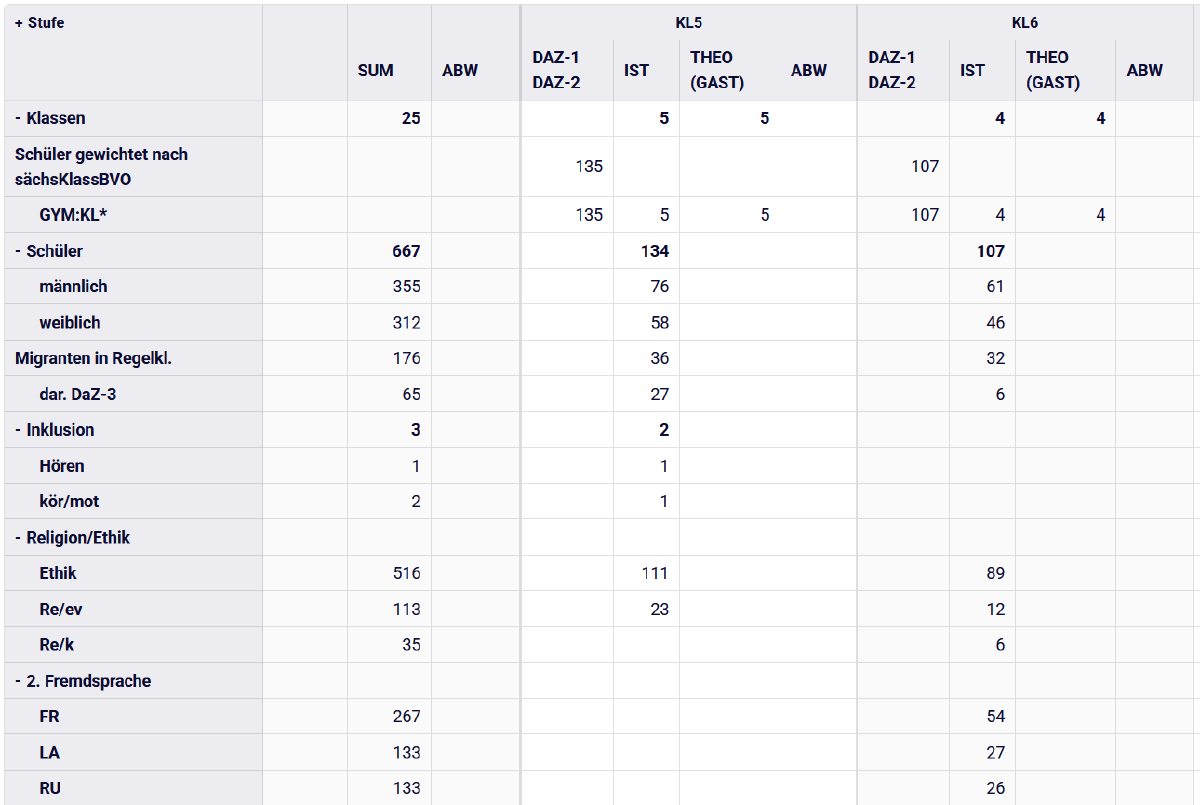 - die Zahl der theoretisch zulässigen Klassen, auf Grund der Schülerzahlen und der Regeln zu Klassenteilern gemäß der gültigen Rechtsvorschriften