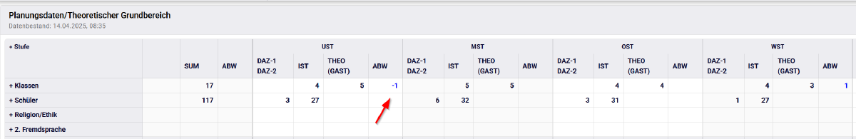 In der Stufe UST sind mit 27 Schülern fünf Klassen zulässig. Die Abweichung beträgt -1, d.h. in der Stufe wurden von der Schule vier Klassen statt fünf gebildet und damit eine Abweichung -1 erzeugt. Dies gleicht sich dann aber mit der Abweichung von +1 in der Stufe WST wieder aus.
