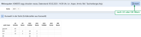 Die Darstellung des Unterrichts in einer interaktiven Tabelle bietet auch die Möglichkeit in der Sekundarstufe II alle GK oder LK herauszufiltern. Die interaktive Tabelle wird über den Schalter '''Export''' aufgerufen. | Die Darstellung des Unterrichts in einer interaktiven Tabelle bietet auch die Möglichkeit in der Sekundarstufe II alle GK oder LK herauszufiltern. Die interaktive Tabelle wird über den Schalter '''Export''' aufgerufen. | ||